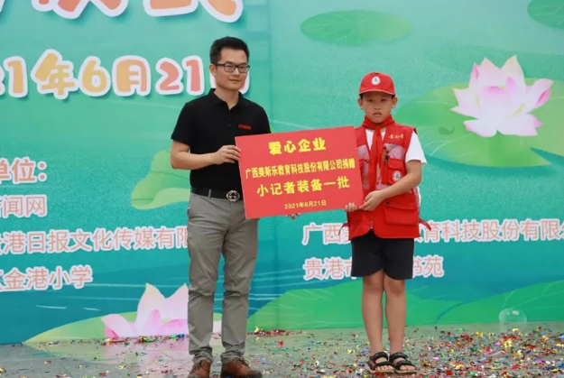 ▲广西美斯乐教育科技股份有限公司为学校赠送童心圆小记者装备一批。