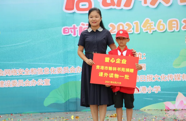 ▲贵港市翰林书苑为学校赠送课外读物一批。